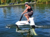 Es kann demnächst tatsächlich passieren, dass Sie denken: "Ich gucke nicht richtig - da fährt doch jemand mit dem Fahrrad übers Wasser." Der Hydrofoiler ist ein Gefährt, das aussieht wie ein Fahrrad: Pedale, Lenker, Sattel. Es hat nur keine Räder, sondern so genannte Foils, also Tragflächen, die das Gefährt quasi übers Wasser gleiten lassen.