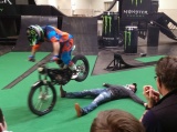 Die meisten Besucher der Messe Motorräder Dortmund fahren auch selbst Motorrad. Aber wohl keiner von ihnen fährt wie die Fahrer in der Halle 4. In der Monster Trial Freestyle Show zeigen sie mehrmals täglich, was alles auf dem Motorrad möglich ist. Collage auch mit reportierenden Zuschauern.