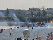 Leadin Es knallt und kracht im Hamburger Hafenbecken, Hubschrauber fliegen knapp über der Wasseroberfläche und Matrosen springen von einem brennenden Boot: Eine simulierte Notfallübung ist eins der Highlights beim Hafengeburtstag Hamburg. An dieser Aktion sind Wasserschutzpolizei, Feuerwehr, DLRG, THW, ADAC und Bundeswehr beteiligt, sagt Oberstleutnant Jörn Plischke, Stabschef des Landes Hamburg. Media text