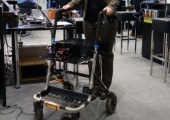 Caroline Armbruster antwortet auf folgende Fragen: 1. Was ist das für ein Rollator, den Sie hier präsentieren? 2. Der Rollator warnt mich, wenn ich mich in und außerhalb meiner Wohnung bewege? 3. Warum die Warnung per Vibration und nicht akustisch? 4. Haben Sie den Rollator auch schon in der Realität getestet? 5. Das System sieht jetzt schon relativ klein aus... 6. Wann glauben Sie, kann so etwas vom Endverbraucher genutzt werden? 7. Versuchen Sie hier auch Investoren zu gewinnen? 8. Wie sind die Reaktionen hier? O-Ton: