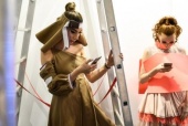 Anmoderation: Choreograph und Show-Producer ist Kevin Oax. Zwischenmoderation 1: Eine Modenschau im laufenden Messebetrieb - örtlich gesehen genau zwischen zwei Messe. Kann das funktionieren? Und, eine reine Modenschau ist es ja auch gar nicht! Zwischenmoderation 2: Gezeigt werden die unterschiedlichsten Kleider, wobei sich bei Modenschauen ja auch immer die Frage stellt: Ist so etwas straßentauglich? Antwort 1: "... Das Konzept ... junge Design-Studenten Möglichkeit ihre Fantasien auszuprobieren ... mit Textilien und Bearbeitungsmethoden, die sich auf den Messen finden ... nicht unbedingt typisch für Mode ... auch ein Blick in die Zukunft ...". Antwort 2: "... Optisch eine sehr lebendige Modenschau ... Leute bleiben nur durch visuelle Reize stehen ... sehr wichtig, dass es ein Wettbewerb ist ... Publikum kann über Tablets und Smartphone wählen ... ich bin über die Menge der Teilnahme erstaunt ..." Antwort 3: "... Keine Kleider unbedingt für die Straße ... individuelle Kleider ... Kleider mit LED ... Stoff, der sich auflöst ... Plastik ... beide Messen zusammenbringen." O-Ton: