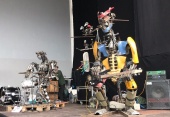 O-Ton Wer hier live auf der Bühne zu hören und zu sehen ist, ist die One Love Machine Band. O-Ton Eine Schrott-Band? O-Ton Die Maschinenteile aus denen die Band über sieben Jahre hinweg gebaut wurde - wild zusammengesucht. Der Bassist besteht in vielen Teilen aus einem alten Motorrad, aber auch Kohlezangen, Flummis, Fernsehantennen oder Automotorenteile wurden für die Entstehung genutzt. Und, das sind die Bandmitglieder: O-Ton Die mächtigen Maschinenschrott-Roboterskulpturen machen Eindruck. Gut zwei Meter groß, ziemlich breit und bei sich haben sie ihre Instrumente, die sie tatsächlich selbst bedienen können. Der Künstler Kolja Kugler ist also auch ein Technikfreak. Ein bisschen verrückt oder Kunst? O-Ton Damit die Band spielen kann, braucht es natürlich etwas Computer-Knowhow. O-Ton Auf der Maker Faire in Friedrichshafen spielt die One Love Machine Band viermal am Tag. Und, so einzigartig wie das ganze Projekt ist, dürfte auch jedes einzelne Konzert werden. O-Ton Tim Kuchenbecker, Redaktion ... Friedrichshafen Direct quote