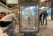 O-Ton Knall So hört es sich an, wenn ein Kletterseil unter voller Zugkraft auf einmal zerreißt. Und so reagieren Besucher, wenn ihnen das einmal demonstriert wird. O-Ton Wobei, davon werden sich später auch noch einige verabschieden. Marek Proba ist Sicherheitsexperte vom Unternehmen Petzl. Auf der Messe Vertical Pro in Friedrichshafen, die sich an Kletterer richtet, hat er Zug- und Zerreißmaschine mit im Gepäck. O-Ton In einem Stahlkäfig, hinter Plexiglasscheiben befindet sich der Hydraulikarm, wenn der nach oben gefahren wird, beginnt im wahrsten Sinne des Wortes die Zerreißprobe. O-Ton Die Messzelle überträgt die Kraft, die gerade ausgeübt wird auf ein iPad, bis O-Ton Knall Genau – es knallt O-Ton Beständiger also, als der Hersteller es selbst angibt. Die Besucher bleiben interessiert stehen. O-Ton Als nächstes sind die Exen dran. Als Exe bezeichnet man im Kletterjargon das Express-Set. Es dient als Verbindungsmittel zwischen dem Haken in der Wand und dem Seil und ist aus Stoff. Getestet werden zwei Exen, eine nagelneue und eine zweite, die zwar auch nagelneu ist, die aber gerade etwa 30 Sekunden auf einem Stein hin und her gerieben wird. O-Ton Und dann wird die Zug- und Zerreißmaschine wieder in Gang gesetzt. O-Ton Das war Nummer 1 O-Ton Und das Nummer 2. Das Ergebnis: erschreckend! Vor allem für die Besucher. O-Ton Denn so ein Knall bei so einer Demonstration öffnet einem die Augen, in der Realität könnte das viel gefährlicher ausgehen. Tim Kuchenbecker, Redaktion … Friedrichshafen Direct quote