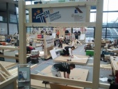Zwischenmoderation: Im Rahmen der Messe „Dach + Holz International 2012“ finden dort nämlich auch die Europameisterschaften der Zimmerer statt. Gestartet sind die besten Zimmerer schon am Dienstagvormittag, aber in den ersten Stunden ging es erst mal nur um Pläne, Maße und so weiter. Die insgesamt 23 Zimmerer aus zehn Ländern waren dabei so konzentriert, dass wir sie nicht einmal kurz für ein Interview stören durften. Jochen Ströhle kann das gut verstehen – er hat es im Jahr 2003 sogar zum Weltmeistertitel gebracht und weiß noch gut, wie sich die Teilnehmer während des Wettbewerbs fühlen …