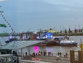 O-TON Tang 1: „…vor sechs Jahren habe ich gar nicht dran geglaubt und den Traum für mich behalten… als sich dann die Möglichkeit bot, war es schwierig, die Leute davon zu überzeugen… wir haben es aber geschafft… am schönsten ist der Moment, wenn man dort steht und der Traum wahr wird…“ Zwischenmoderation: Um die größte schwimmende Bühne der Welt aufs Wasser zu bringen, hat die Reederei Fairplay Towage zu ungewöhnlichen Mitteln gegriffen: O-TON Tang 2: „…Wir haben hier eine Hochseeplattform, die normalerweise im Atlantik und Pazifik unterwegs ist… normalerweise werden damit Flugzeugteile, Trafostationen oder Windkraftanlagen transportiert… darauf bauen wir ein Doppelbühnenprinzip: fast 100 Meter lang, 30 Meter breit und ein Eigengewicht von 10.000 Tonnen…“ Zwischenmoderation: Der Aufbau der Bühne hat mehr als eine Woche gedauert und war gar nicht so einfach, verrät Birger Tang. O-TON Tang 3: „…Das Besondere ist, dass wir uns auf dem Wasser befinden. Wir hatten mit Ebbe und Flut zu kämpfen… wir können nicht von mehreren Seiten an der Bühne bauen… Die Logistik war also ein ganz großes Thema… das war ein bisschen wie beim puzzlen…“ Zwischenmoderation: Die erste Show gab’s am Freitagabend. Scooter und die Hamburger Goldkehlchen haben da performt. Außerdem hat Stage Musicals ein „Best of“ mehrerer Musicals präsentiert. Am Samstagabend legt DJ „Alle Farben“ auf der Bühne auf. Mit dieser Aktion haben Birger Tang und die Fairplay Towage Group die Aktion aus dem Vorjahr noch mal getoppt. O-TON Tang 4: „…nach dem letzten Jahr, wo wir tanzende Menschen auf einem tanzenden Schiff hatten, haben wir noch mal einen draufgesetzt… größer und anspruchsvoller… ich bin froh, dass das so funktioniert hat…“ Abmoderation: Die Organisatoren haben unter anderem auch „Guinness“ geschrieben, um einen Eintrag ins „Guinness Buch der Rekorde“ zu bekommen. Eine Antwort gab’s bis heute nicht. Direct quote